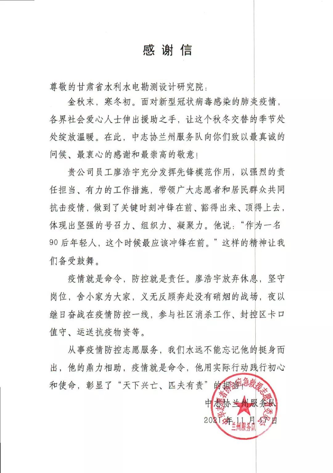 近日,水電設(shè)計(jì)院收到中志協(xié)蘭州服務(wù)隊(duì)和團(tuán)結(jié)新村街道天平街社區(qū)發(fā)來的感謝信。信中對(duì)水電設(shè)計(jì)院規(guī)劃院?jiǎn)T工廖浩宇在此次疫情發(fā)生后,主動(dòng)請(qǐng)纓參加疫情防控服務(wù)工作,甘當(dāng)疫情防控最美逆行者,持續(xù)堅(jiān)持26天志愿者服務(wù)的先進(jìn)事跡表示感謝。