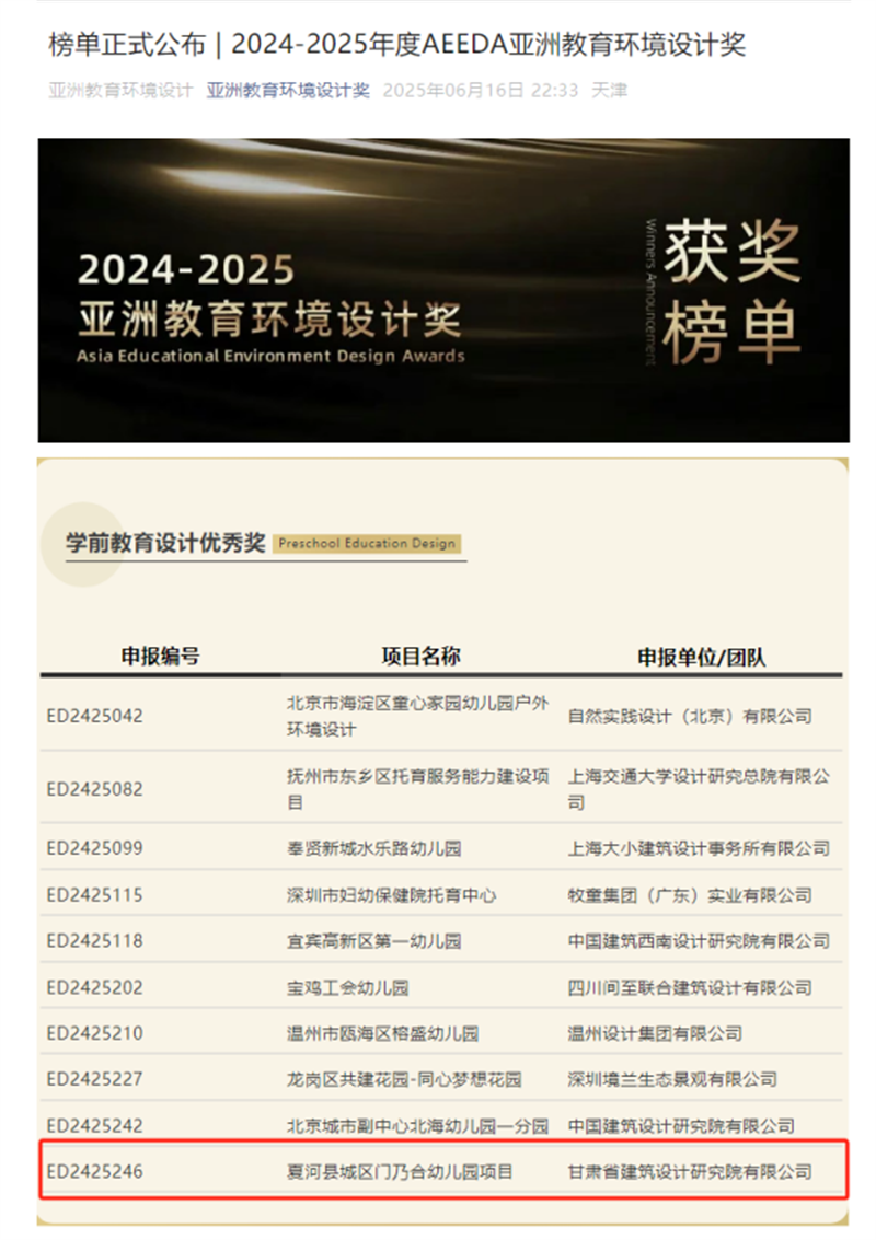 近日,備受矚目的2024-2025年度AEEDA亞洲教育環(huán)境設(shè)計獎(Asia Educational Environment Design Awards)獲獎名單正式揭曉。由甘肅工程咨詢集團旗下省建筑設(shè)計院設(shè)計的夏河縣城區(qū)門乃合幼兒園項目,從百余件參賽作品中脫穎而出,榮膺學前教育設(shè)計領(lǐng)域優(yōu)秀獎,為甘肅建筑設(shè)計行業(yè)贏得了國際聲譽。