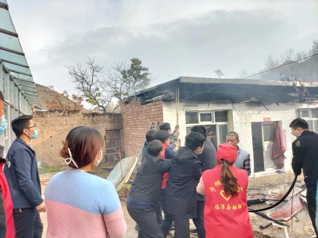 聽到村民們的呼救聲,正在村口疫情防控監(jiān)測點值守的幫扶工作隊隊員、包村干部與鎮(zhèn)領導、村“兩委”干部及志愿者一起,第一時間沖向了火災現(xiàn)場,實施開展撲救工作?,F(xiàn)場火勢兇猛,盡管眾人一起用水傾澆,卻仍未阻止火勢蔓延。瞬間,屋頂?shù)臋M梁也燒著了,發(fā)出噼啪的響聲,房頂隱約在搖晃,可大家依然奮不顧身地救火,甚至有人沖上了危險的屋頂。