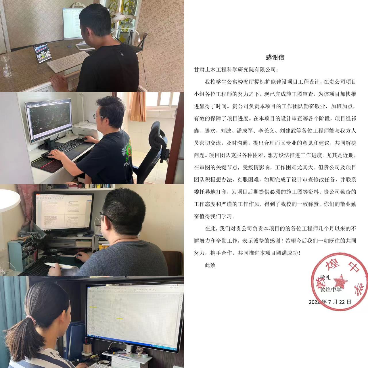 設(shè)計一所堅決貫徹土木工程院黨委要求,第一時間部署疫情防控工作。在部門職工居家辦公期間,積極與軟件公司溝通協(xié)調(diào),為所有設(shè)計軟件增加了在線使用版,并利用釘釘、微信進行線上溝通,疫情期間完成了2022年華亭市安口鎮(zhèn)老舊小區(qū)住宅樓棚戶區(qū)改造項目施工圖審查、甘肅武威工業(yè)園區(qū)天馬資源開發(fā)有限公司鋼結(jié)構(gòu)標準化廠房建設(shè)項目、敦煌中學學生公寓樓餐廳提標擴能建設(shè)等項目,得到建設(shè)單位的一致好評和致信感謝,極大提升了部門員工技術(shù)創(chuàng)新、全方位服務(wù)的工作熱情。