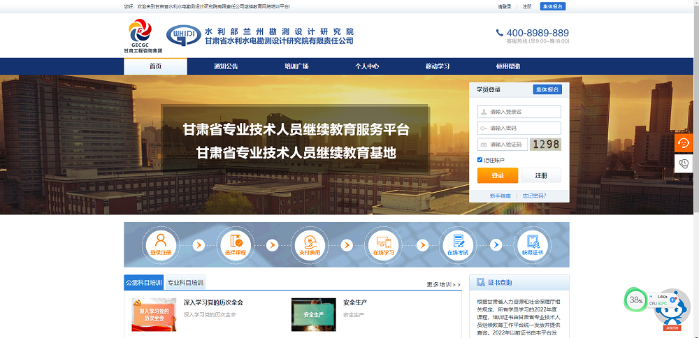 目前,平臺已正式上線,網址為:http://gsgczx.lllnet.cn/。學員可在平臺購買課程后,通過PC端、移動客戶端等多渠道開展遠程學習。完成學習任務并考核合格,即可獲得基地發(fā)放的培訓證書,該培訓證書是甘肅省人力資源與社會保障廳認可的學分證明。平臺可供2萬余人學習,擁有注冊登錄、報名繳費、在線學習及考核(支持PC端和移動客戶端)、證書打印、后臺管理等功能?,F有公需、專業(yè)課程4000余門,其中基地開發(fā)自制水利類課程4門10學時,能夠滿足各類專業(yè)技術人員的繼續(xù)教育學習。