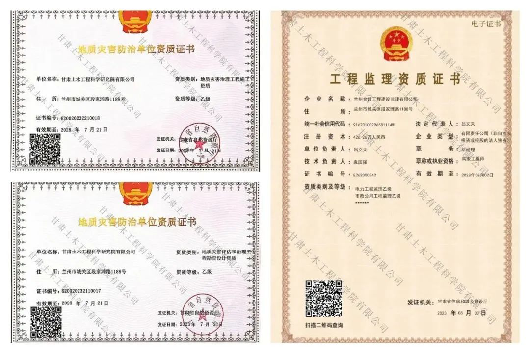 近期,土木工程院申報的地質(zhì)災(zāi)害評估和治理工程勘查設(shè)計乙級、地質(zhì)災(zāi)害治理工程施工乙級兩項(xiàng)資質(zhì)獲省自然資源廳批準(zhǔn)。土木工程院全資子公司蘭州金建工程建設(shè)監(jiān)理有限公司申報的電力工程監(jiān)理乙級資質(zhì)也順利通過省住房和城鄉(xiāng)建設(shè)廳審批。