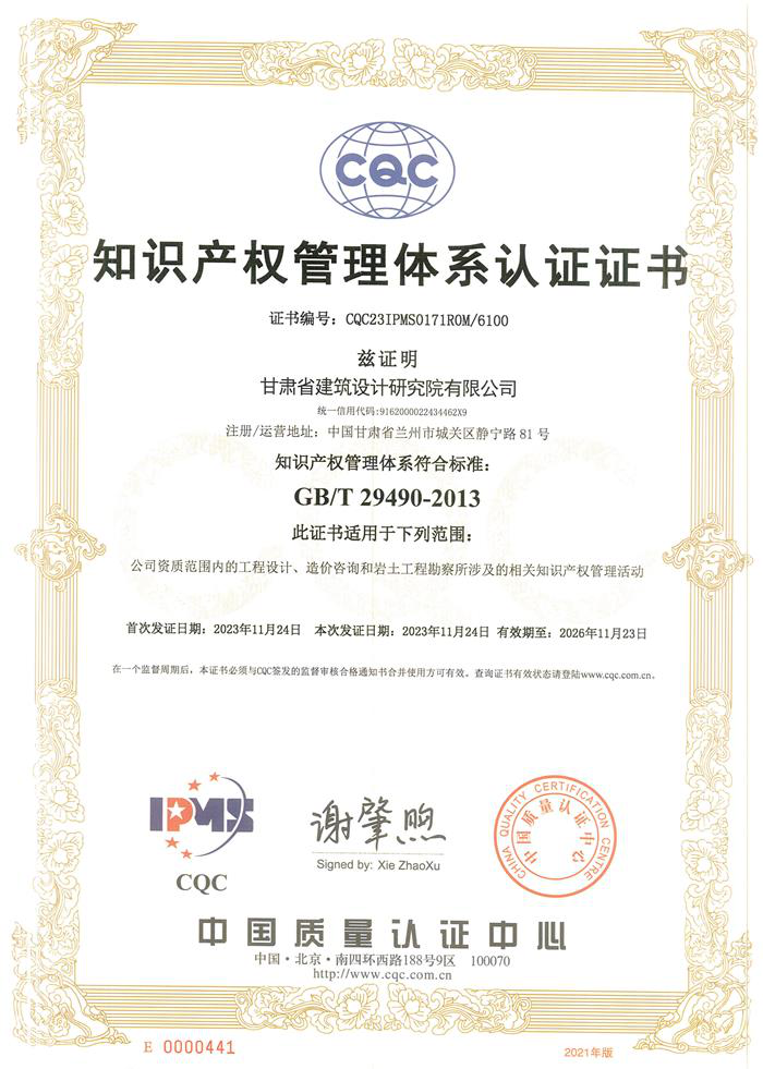 近日,省建筑設(shè)計院收到由中國質(zhì)量認(rèn)證中心頒發(fā)的編號為CQC23IPMS0171ROM/6100的《知識產(chǎn)權(quán)管理體系認(rèn)證證書》,標(biāo)志著省建筑設(shè)計院知識產(chǎn)權(quán)管理體系完全符合GB/T 29490-2013標(biāo)準(zhǔn),這是省建筑設(shè)計院在國家層面知識產(chǎn)權(quán)領(lǐng)域取得的重要認(rèn)可,進(jìn)一步提升了省建筑設(shè)計院的綜合競爭力。