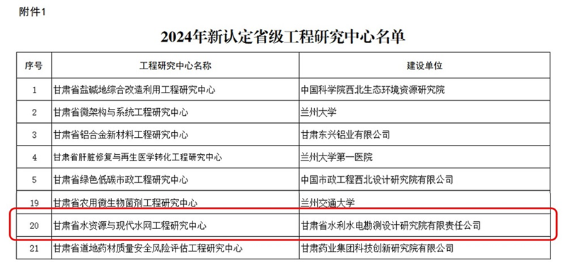近日,省發(fā)展和改革委員會公布《2024年新認(rèn)定及優(yōu)化整合省級工程研究中心名單》,省水電設(shè)計院申報的“甘肅省水資源與現(xiàn)代水網(wǎng)”成功獲批立項“省級工程研究中心”,標(biāo)志著公司在水利工程科研平臺建設(shè)方面取得了重大突破。